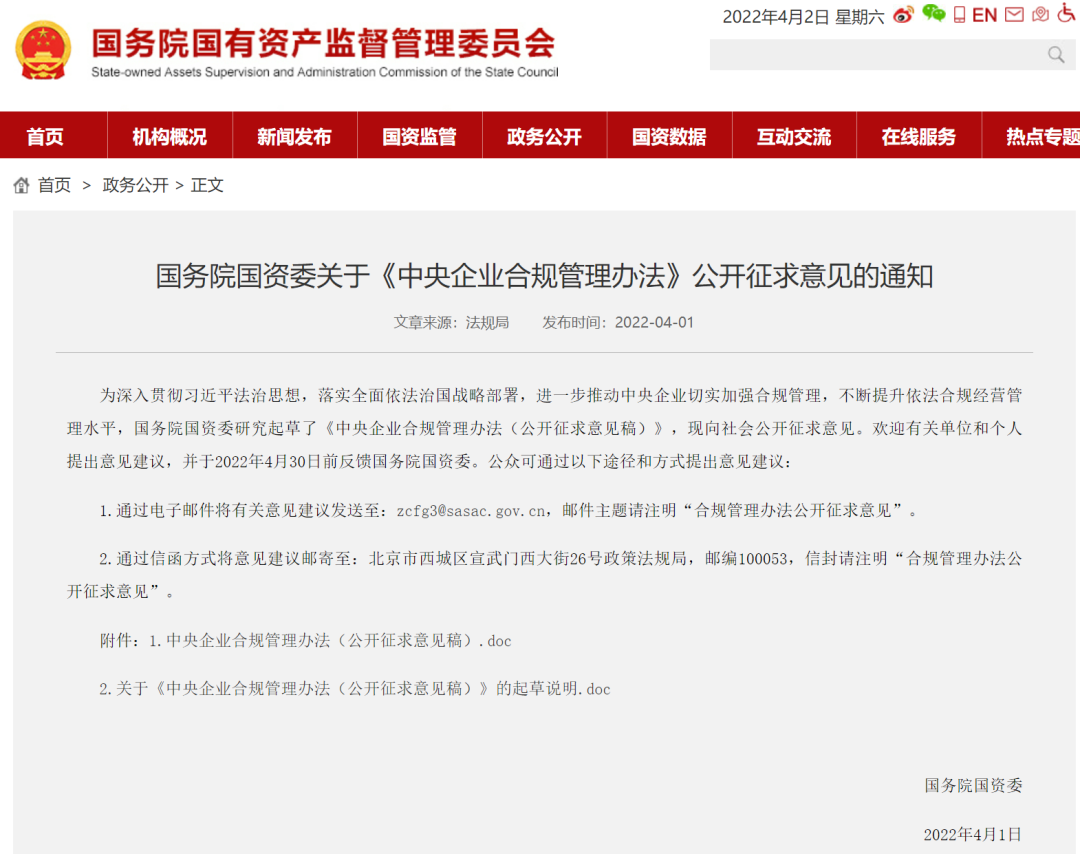 进一步推动中央企业切实加强合规管理,不断提升依法合规经营管理水平,4月1日,国务院国资委对外发布《中央企业合规管理办法(公开征求意见稿)》(以下简称《办法》),并向社会公开征求意见。