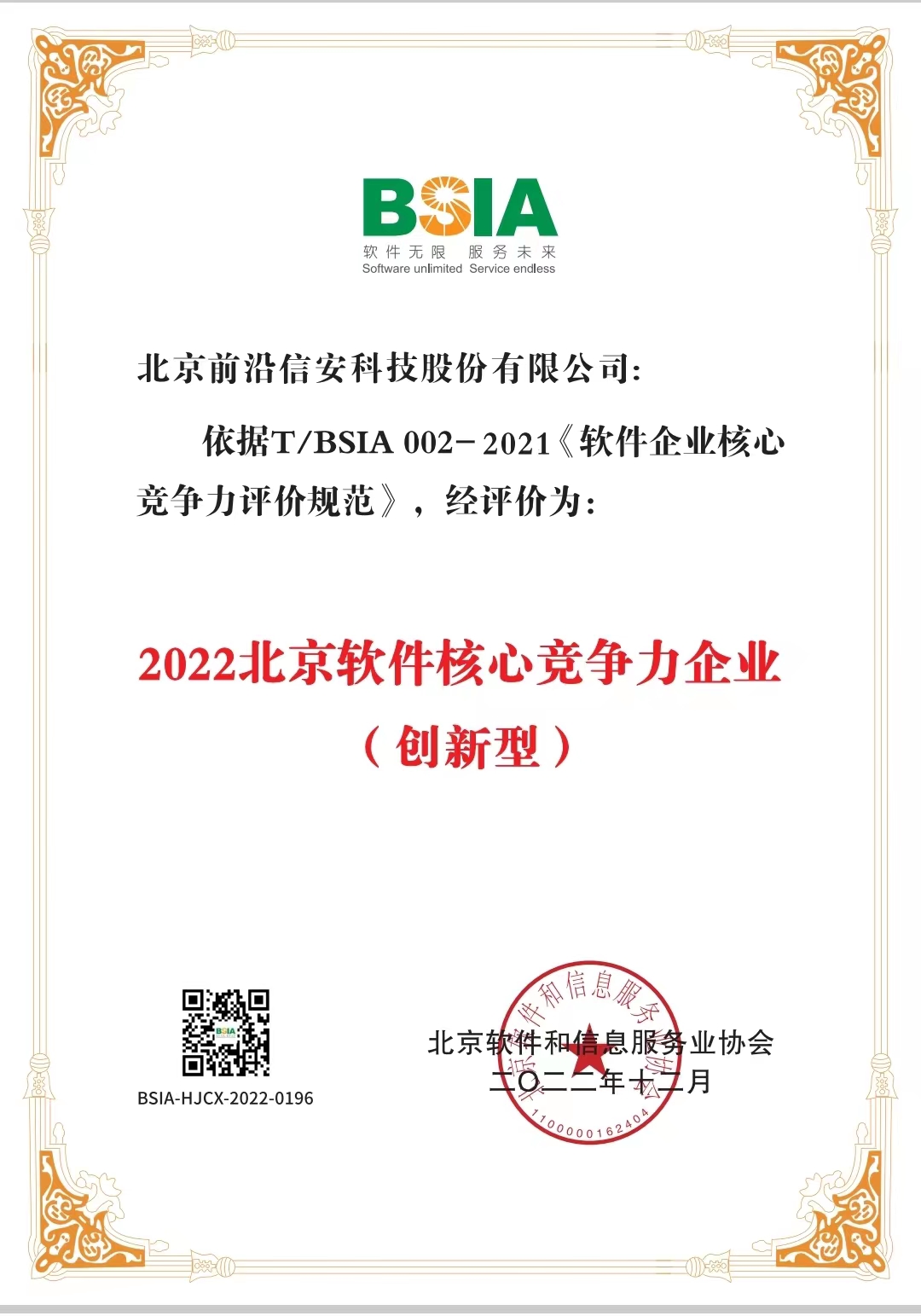 2022年12月,依据T/BSIA 002-2021《软件企业核心竞争力评价规范》华体会官方端网站登录入口取得了2022北京软件核心竞争力企业(创新型)认定证书
