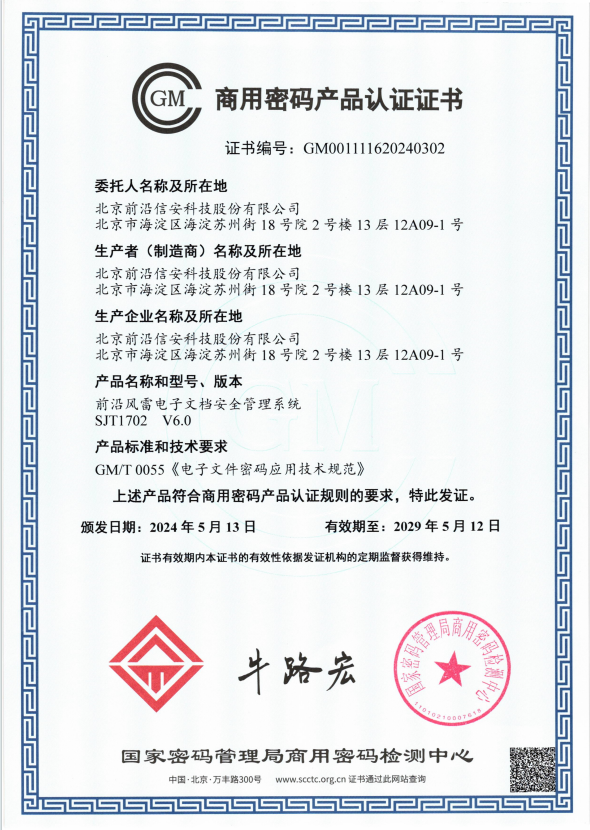 近日,华体会官方端网站登录入口自研产品成功取得《商用密码产品认证证书》,产品符合GM/T0065-2019《商用密码产品生产和保障能力建设规范》、GM/T0066-2019《商用密码产品生产和保障能力建设实施指南》,顺利通过国家密码管理局安全性审查,取得由国家密码管理局商用密码检测中心颁发的《商用密码产品认证证书》,再次彰显了我公司在信息安全领域的创新实力和技术水平。